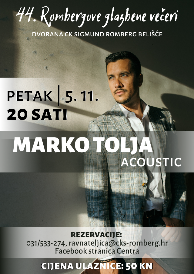 BELIŠĆE Ovogodišnje 44. Rombergove glazbene večeri u Centru za kulturu Sigmund Romberg otvorit će jedan od najboljih hrvatskih vokala – Marko Tolja, u akustičnoj verziji.