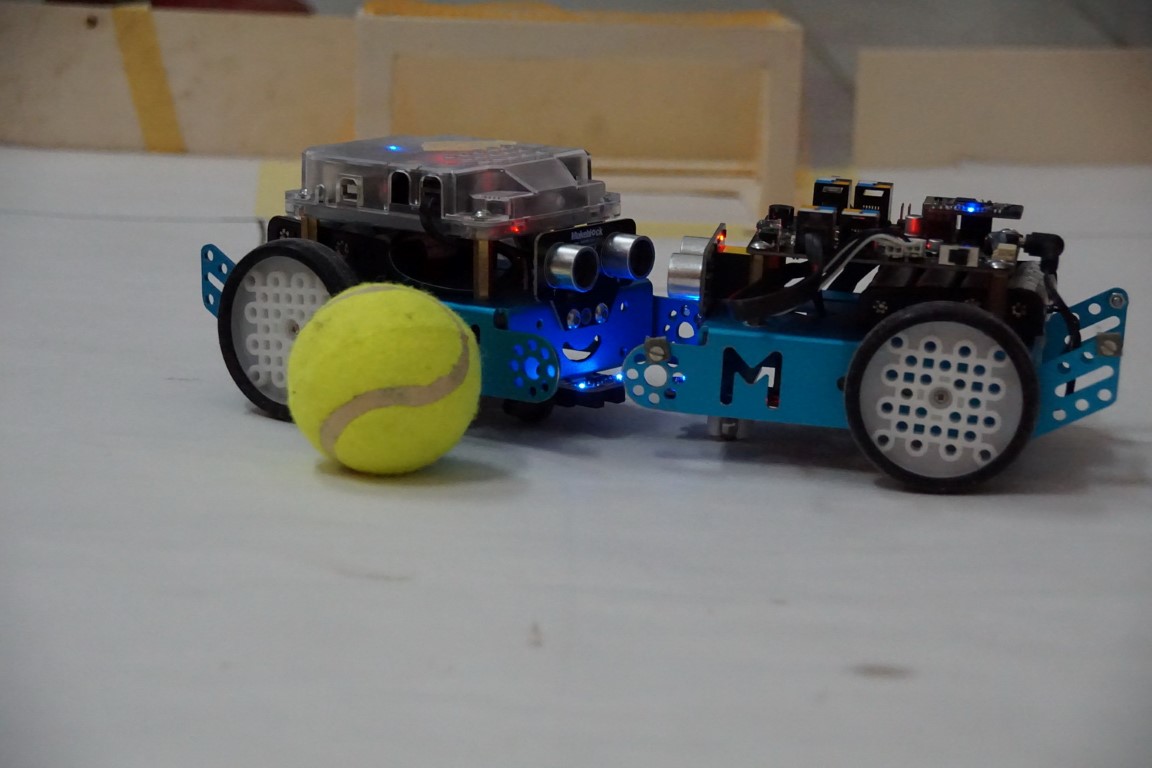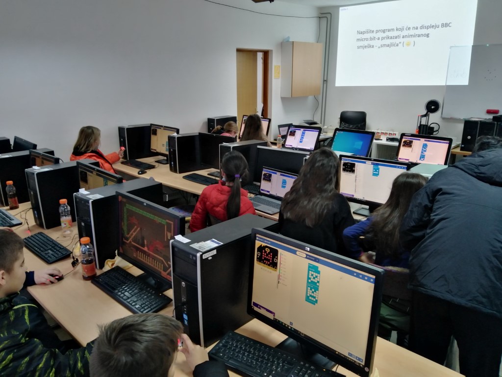 Robotičari su svoju radionicu imali u četvrtak. Njih 25 podjeljeno je u dvije grupe. Profesor Antolović radio je sa jednom grupom programiranje microbitova, a Biljana Pantoš i Goran Dojkić su sa drugom grupom imali "nogobot" - nogomet sa robotskim kolicima mBotovima. Grupe su se zamijenile na pola vremena radionice.