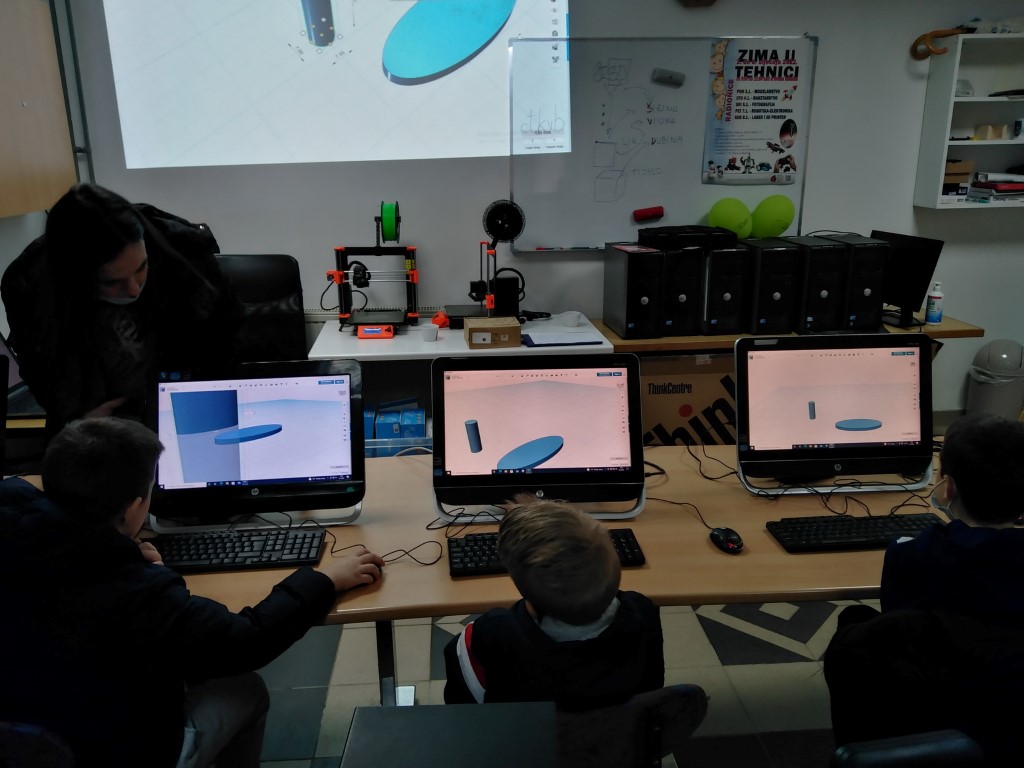 Zadnji dan "14. Zime u tehnici" predviđen je za dvije radionice, pa smo tako podijelili i polaznike. U radionici 3D modeliranja i printanja sudjelovalo je 9 polaznika. Za ovu radionicu imali smo pomoć iz ZTK OBŽ. Njihovi predavači Ida Đurkić i Hrvoje Kerata naučili su male tehničare modelirati u 123D Design programskom okruženju koje je odabrano zbog jednostavnosti korištenja, licence otvorenoga koda i sličnosti sa ostalim profesionalnim programima istoga proizvođača kao što su AutoCAD, 3DS max, Maya ili Fusion 360.
