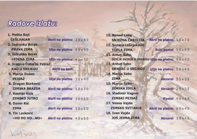 Ova lijepa tradicija rezultat je dugogodišnje uspješne suradnje između belišćanske knjižnice i udruge „Bel-art“ koje svojim trudom i radom čine veliki doprinos kulturnom bogatstvu grada Belišća. Oni koji se žele uvjeriti u to moći će doći pogledati slikarske radove sa zimskim motivima u raznim tehnikama u predvorju zgrade Gradske uprave i Knjižnice do kraja prosinca.