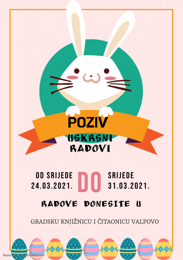 Pozivamo vas da svoje radove donesete u Gradsku knjižnicu i čitaonicu Valpovo od srijede, 24.ožujka pa sve do četvrtka, 01. travnja . Mi ćemo Vaše radove izložiti i dati priliku da ih vidi veliki broj građana koji svakodnevno prođe kroz knjižnicu.