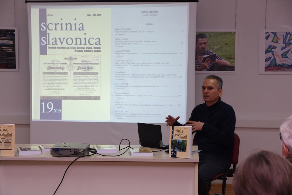 Publika se na predstavljanju mogla upoznati sa sadržajem Scrinie Slavonice 19 i 20 i s uredničkom koncepcijom ovoga časopisa, jedinog znanstvenog historiografskog časopisa koji se sustavno bavi poviješću prostora današnje Slavonije od antičkih vremena pa sve do suvremene povijesti.
