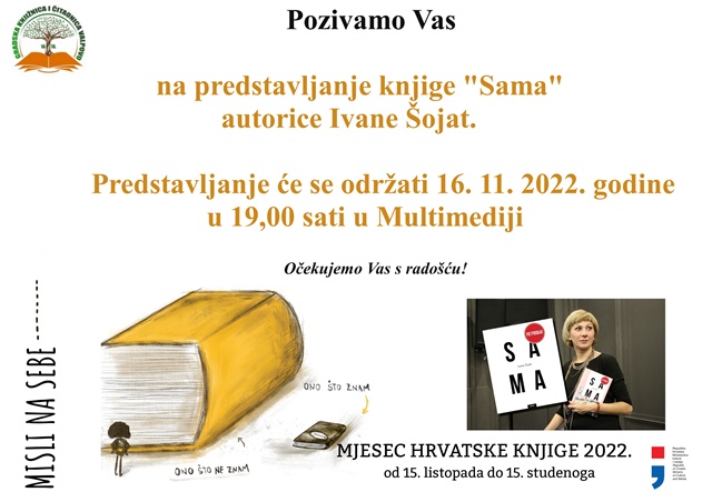 VALPOVO Gradska knjižnica i čitaonica Valpovo organizira, povodom obilježavanja Mjeseca hrvatske knjige, književni susret s nagrađivanom autoricom Ivanom Šojat i predstavljanje njezinog najnovijeg romana „Sama“.