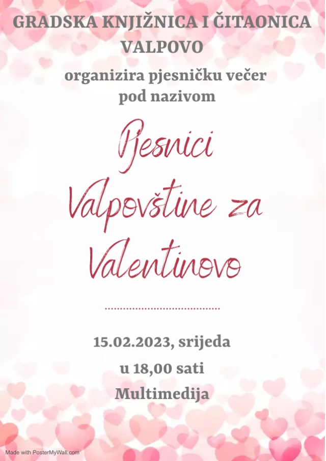 U srijedu, 15. VELJAČE 2023. godine, s početkom u 18,00 sati u Multimediji knjižnice, pjesnici Valpovštine održat će pjesničku večer gdje će iznijeti svoje, ali i najpoznatije ljubavne pjesme.