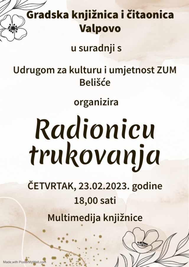 VALPOVO Gradska knjižnica i čitaonica Valpovo organizira još jedno zanimljivo događanje u suradnji s Udrugom za kulturu i umjetnost ZUM Belišće.
