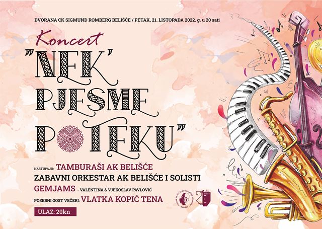 BELIŠĆE Centar za kulturu Sigmund Romberg Belišće i Amatersko kazalište Belišće s ponosom najavljuju koncert “Nek’ pjesme poteku” koji će se održati u petak, 21. listopada 2022. godine s početkom u 20 sati, u dvorani Centra za kulturu.