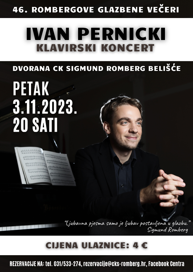 BELIŠĆE U petak, 3. studenoga 2023. godine, s početkom u 20 sati, započinju 46. Rombergove glazbene večeri klavirskim koncertom sjajnog mladog pijanista Ivana Pernickog.