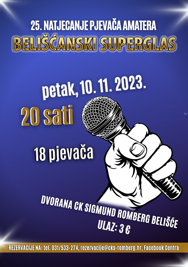 BELIŠĆE U petak, 10. studenoga 2023. godine, u 20 sati, u dvorani Centra za kulturu Sigmund Romberg, održat će se 25. natjecanje pjevača amatera “Belišćanski superglas”.