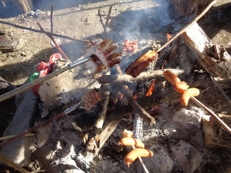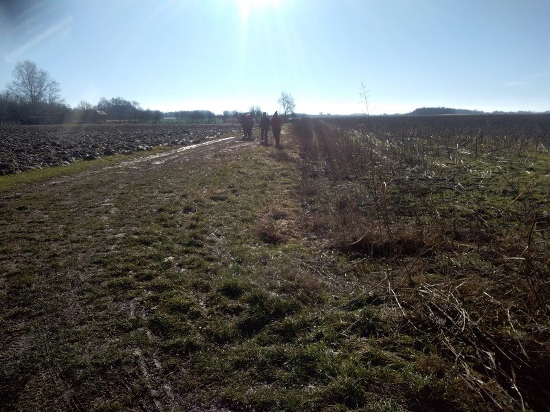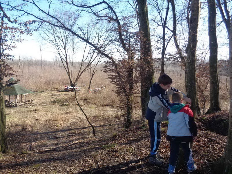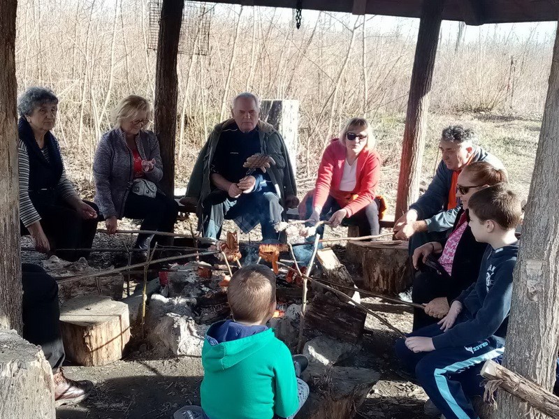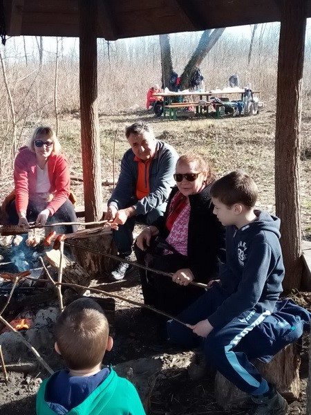 Stigao je još jedan naš član, malo se družio s nama i odlazi dalje hodati. Privlači nas miris pečene slanine i mi uzimamo naše delicije za pečenje i pridružujemo se ekipi uz vatru. Nakon ručka nastavljamo druženje uz kavu i čaj. Bliži se vrijeme povratka, spremamo stvari i ostavljamo iza sebe čist i uredan prostor. Staza je kroz šumu uz baru Jugovaču, a na njoj su dva prekrasna labuda. Krenule su i visibabe koje su nam uljepšale ovaj zimski a ipak proljetni dan.