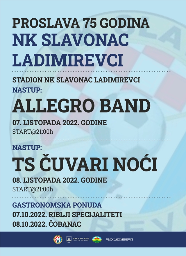 U petak, 7. listopada i subotu 8. listopada, u večernjim satima uz glazbeno-zabavni program i primjerenu gastronomsku ponudu na stadionu kluba slavljenika zahvalit ćemo svim prijašnjim predsjednicima, članovima uprave i svima ostalima koji su doprinijeli radu našeg nogometnog kluba. Radujemo se predstojećim godinama ispred nas, u nadi da će klub napredovati i nadmašiti dosadašnja postignuća, pozvao je tajnik NK Slavonac Ladimirevci Josip Šestanj.
