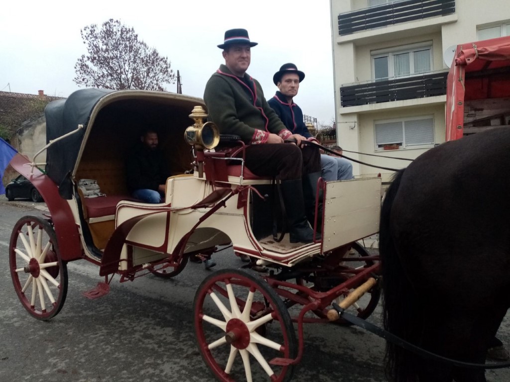 Nakon povratka sa staza, krenuli smo pred crkvu gdje je svećenik blagoslovio vino i sve nas. Razdragana skupina pjevača je uljepšala kratko zadržavanje, a nazdravili smo uz vino koje su nam sipali kočijaš iz spremnika koji je ugrađen u zadnji dio zaprežnih kola. Vlasnici su iz obližnjih mjesta, pa čak i iz požeškog kraja.
