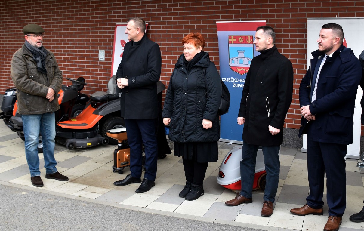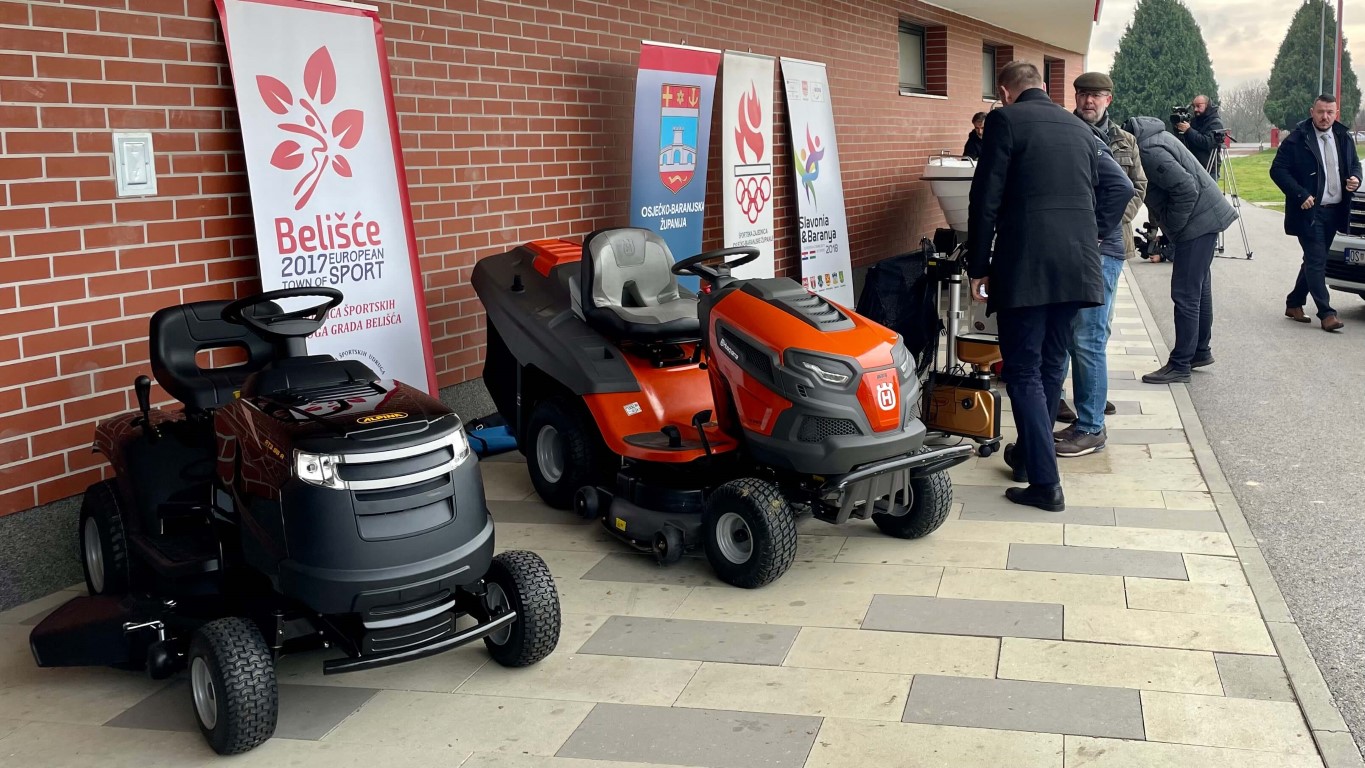 Riječ je o nabavci krupne opreme, tri kombija nabavljena u suradnji Osječko-baranjske županije, Hrvatskog olimpijskog odbora i gradova Belišća, Valpova i Đakova, zatim devet traktorskih kosilica te po jednog čamca (za VK „Iktus“), montažnog spremišta (za Aero klub Osijek), stolnoteniskog robota (za STK „Vodovod-Osijek“) i teniskog topa (za TK „Vidova Gora“ Osijek).