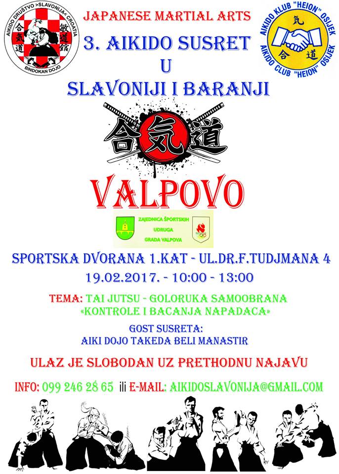 Nakon Belog Manastira i Osijeka, sada je na redu grad Valpovo. Susret organizira Aikido Društvo "Slavonija" sa sjedištem u Valpovu uz podršku Zajednice Sportskih Udruga grada Valpova! Tema seminara je Tai jutsu (goloruka borba), a vodit će ga domaćin Alen Zita 2.Dan Aikikai (licencirani instruktor Hrvatskog Aikido Saveza), Roman Rogač 2.Dan Aikikai i Ante Papić 1.Dan Aikikai iz Aikido kluba "Heion" Osijek. Gost susreta je Željko Dalić 2.Dan Jiu Jitse iz "Aiki dojo Takeda" iz Belog Manastira. Ulaz je slobodan uz najavu i dobrodošli su svi pojedinci i klubovi koje zanimaju japanske borilačke vještine!