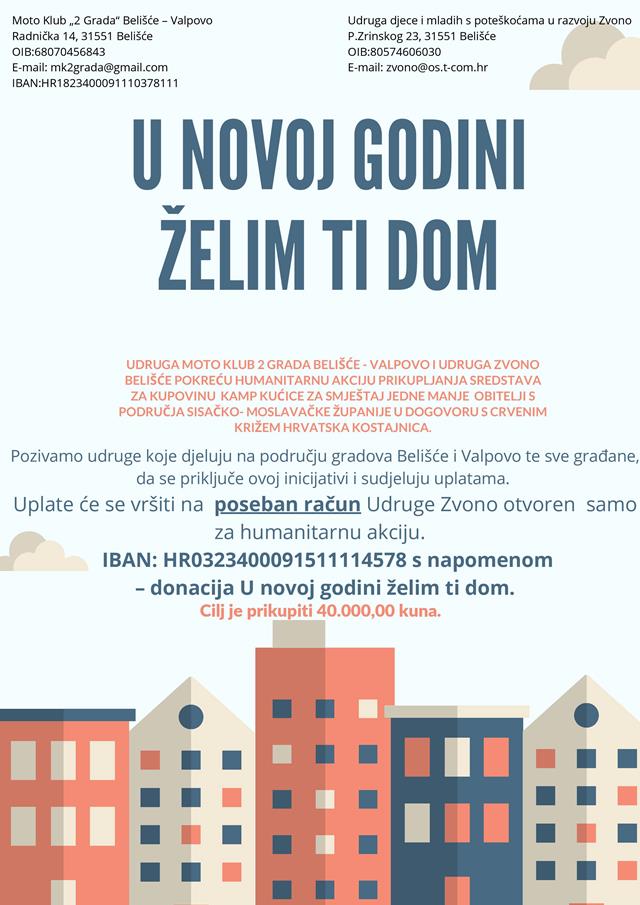 -U Humanitarnoj akciji "U novoj godini želim ti dom" koju provode Udruga Moto klub 2 grada Belišće - Valpovo i Udruga Zvono Belišće, prikupljena su sredstva za kupovinu kućice za smještaj jedne manje obitelji sa područja Sisačko- moslavačke županije u suradnji s Crvenim križem Hrvatska Kostajnica. Humanitarna akcija traje još kratko kako bi se prikupila sredstva za prijevoz kućice do odredišta!