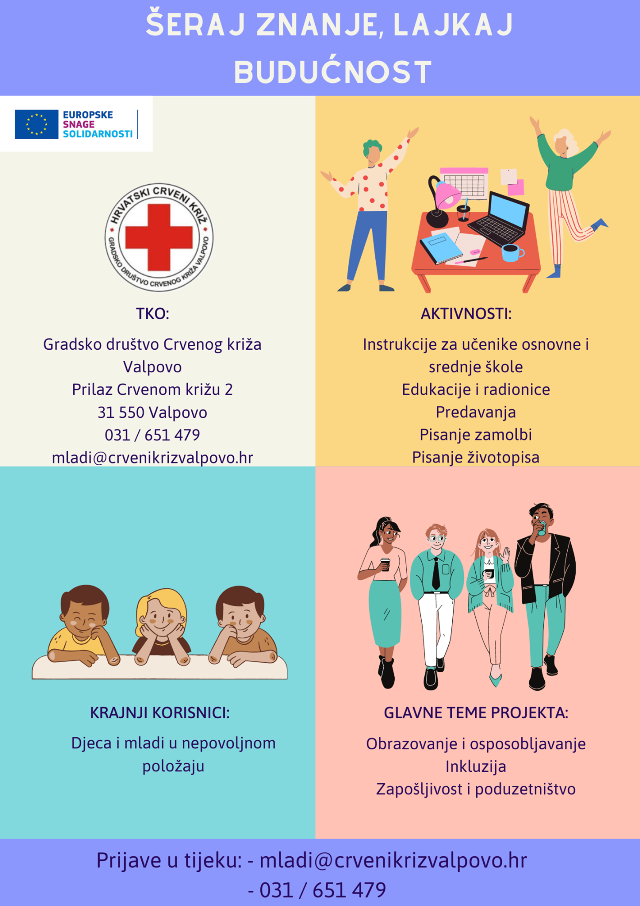 VALPOVO Gradsko društvo Crvenog križa Valpovo ostvarilo je financiranje Projekta solidarnosti naziva „ Šeraj znanje, lajkaj budućnost“ u okviru Poziva na dostavu projektnih prijedloga za program Europske snage solidarnosti za 2020. godinu.