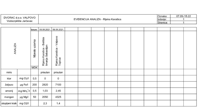 Laboratorij vodocrpilišta Jarčevac proveo je analizu vode rijeke Karašice na pet parametra. Klor, amonij, željezo, mangan i otopljeni kisik.