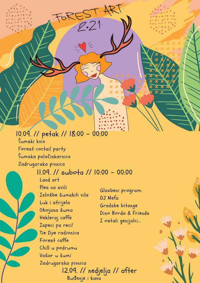 Umjetnici i kreativci imaju priliku predstaviti sebe kroz izlaganje svojih umjetničkih radova ili kroz izvedbu svojih radova. Kroz radionice i izložbe, mladi će umjetnici imati priliku prezentirati svoja znanja i vještine te prikazati svoje skulpture, slike, grafike, instalacije ili performanse, a svi posjetitelji će moći uživati u njihovim prezentacijama. Ove godine Forest art festival održat će se 10. i 11. rujna na Citadeli – kampu udruge Zvono, u Belišću.