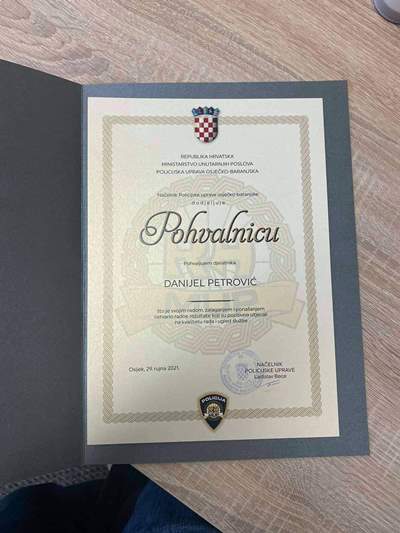 U životu četrdesetjednogodišnjaka, koji je već 22 godine na raznim zadaćama u Policiji, značajno priznanje, tim više što ga prima u sklopu obilježavanja Dana policije, za izvršenje poslova na prikupljanju i obradi podataka za podizanje kaznene prijave protiv trojice počinitelja ratnog zločina protiv civilnih i ratnih zarobljenika na području Dalja u vrijeme Domovinskog rata.