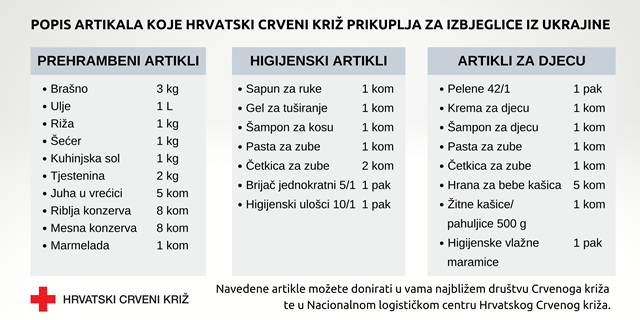 Popis artikala rezultat je dogovora s Crvenim križevima iz Ukrajine i okolnih zemalja. Naime, tim Hrvatskog Crvenog križa je proteklih tjedana boravio u Ukrajini te provjerio stanje izravno na terenu kako bi se uvjerili što je točno potrebnoraseljenim osobama iz Ukrajine, kao i najbolji način dostave. Sukladno s tim, ali i iskustvom rada s izbjeglicama koje su zaštitu potražile u Hrvatskoj, kreiran je popis potrebnih proizvoda i Hrvatski Crveni križ trenutno neće prikupljati ništa osim navedenog.