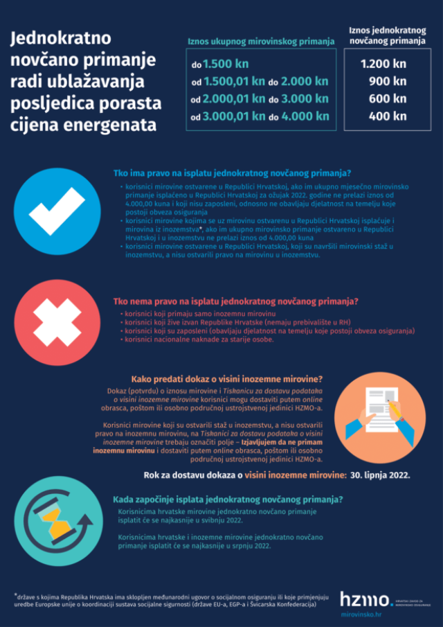 Hrvatski zavod za mirovinsko osiguranje obavijestio je javnost o isplati jednokratnog novčanog primanja radi ublažavanja posljedica porasta cijena energenata.
