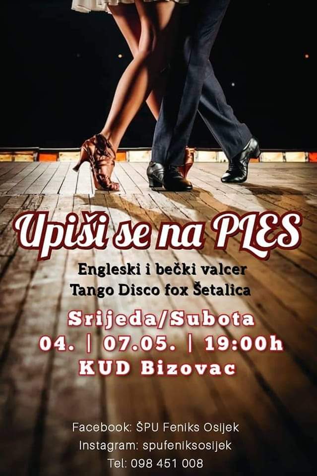 -U sklopu plesnog tečaja po vrlo pristupačnoj cijeni, koji će se održati u prostorijama KUD-a Bizovac (termini petak i subota od 19 sati), polaznici će uz stručnog voditelja uvježbavati engleski valcer, bečki valcer, tango, sving, polku i medison. Detaljnije informacije o upisu na tečaj društvenih plesova mogu se dobiti na broj mobilnog telefona 098/451-008”, izvijestio je načelnik Općine Bizovac Srećko Vuković.