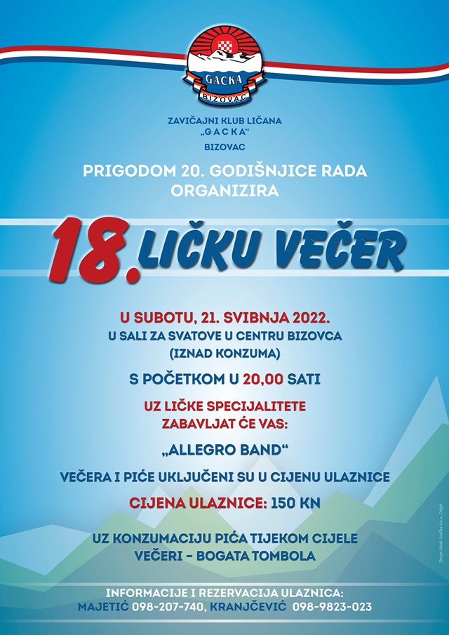 BIZOVAC Zavičajni klub Ličana „Gacka“ iz Bizovca, prigodom obilježavanja 20. godišnjice rada, organizira 18.ličku večer.