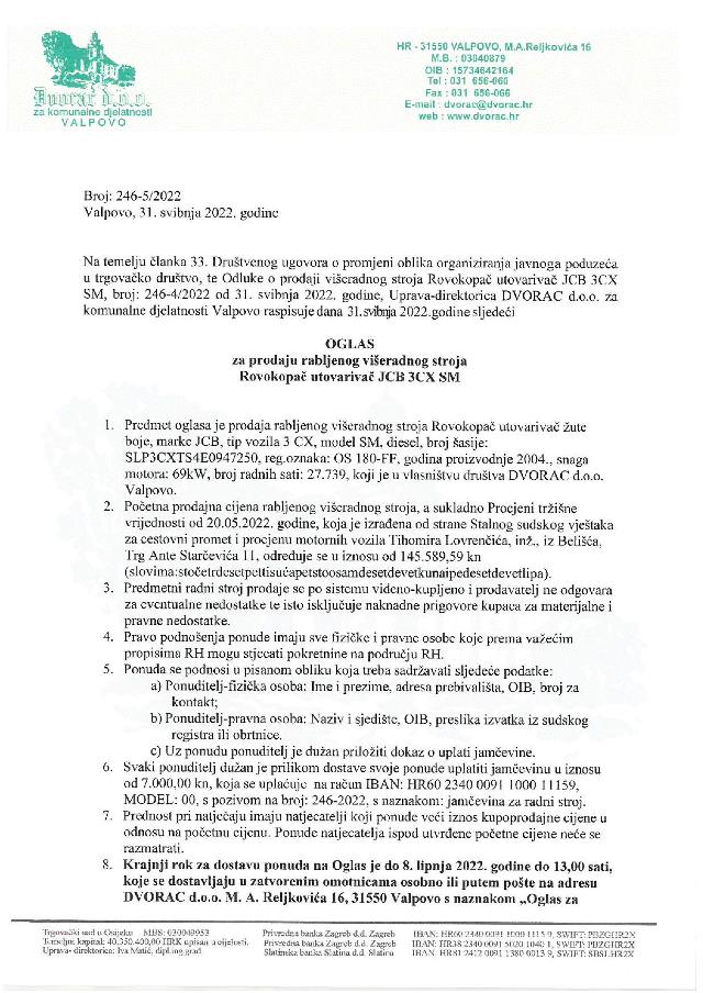 VALPOVO Dvorac d.o.o. objavljuje oglas o prodaji rabljenog višeradnog stroja Rovokopač-utovarivač JCB 3CX SM.