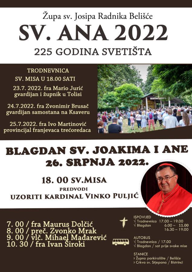 Na sam blagdan, u Svetištu sv. Ane na Dravi, u 18 sati svečano euharistijsko slavlje predvodit će uzoriti kardinal Vinko Puljić, vrhbosanski nadbiskup u miru.