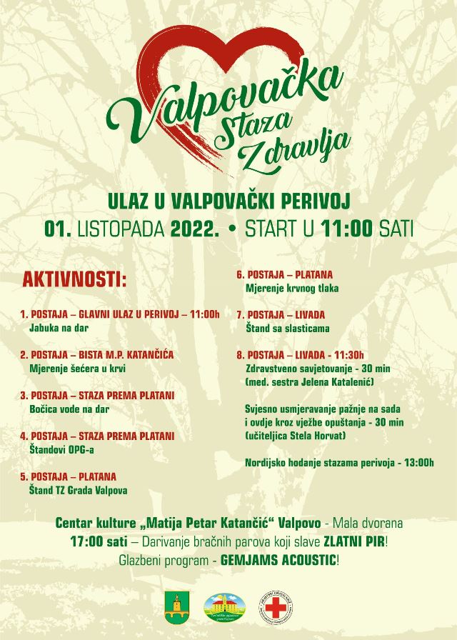 Druga Valpovačka staza zdravlja održat će se u subotu, 1. listopada 2022. godine s početkom u 11:00 sati ispred glavnog ulaza u valpovački perivoj, a organizatori Turistička zajednica Grada Valpova, Grad Valpovo u suradnji s Gradskim društvom Crvenog križa Valpovo, pozivaju sve svoje sugrađane i goste, a posebno osobe starije životne dobi, da se aktivno uključe u provođenje aktivnosti.