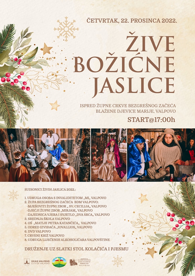 Žive božićne jaslice će se ove godine upriličiti u četvrtak, 22. prosinca 2022. godine s početkom u 17:00 sati ispred Župne crkve Bezgrešnog začeća Blažene Djevice Marije u Valpovu.
