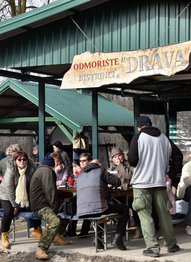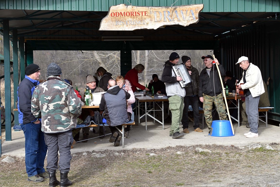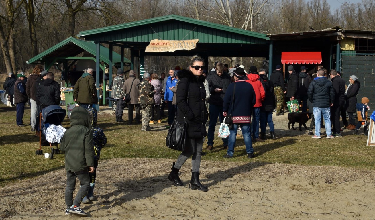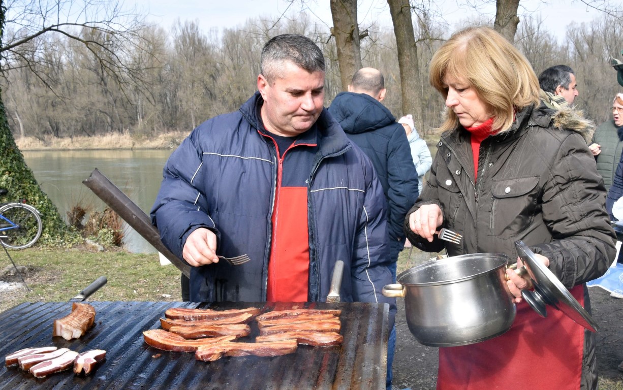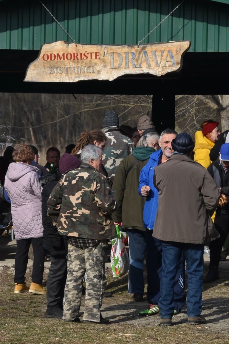 BISTRINCI Danas se po lijepom i sunčanom vremenu na Odmorište Drava u Bistrincima okupio velik broj izletnika, a mirisi dima i pečene slanine što su se širili predjelom uz rijeku, odali su i uzrok gužve.