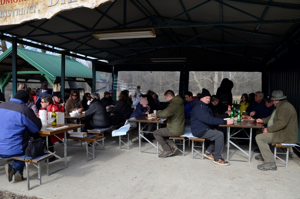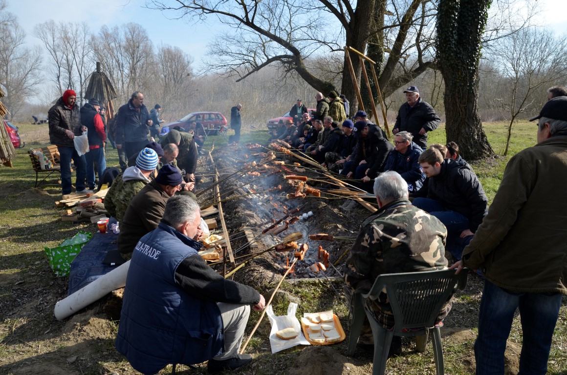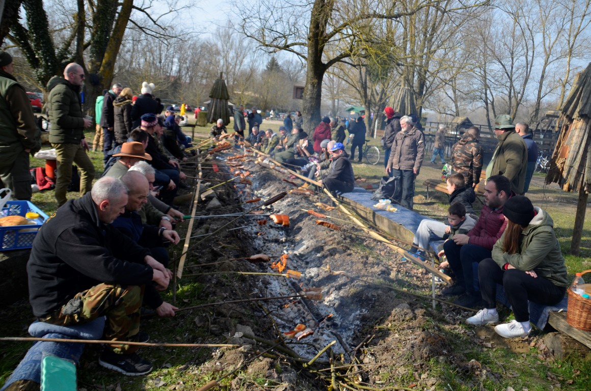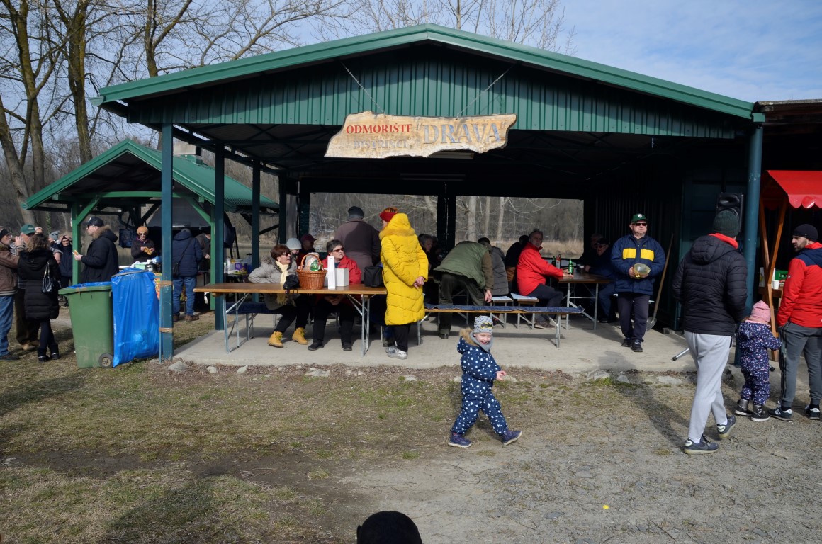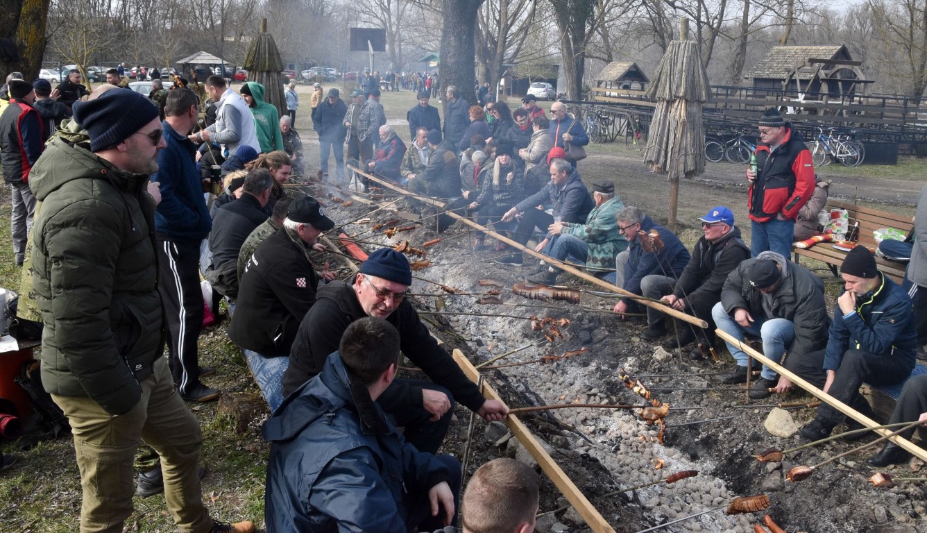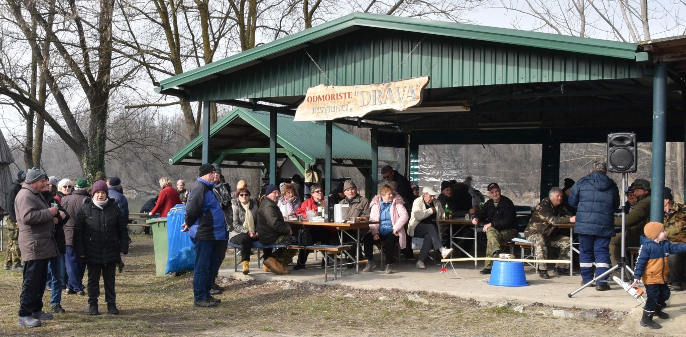 BISTRINCI Danas se po lijepom i sunčanom vremenu na Odmorište Drava u Bistrincima okupio velik broj izletnika, a mirisi dima i pečene slanine što su se širili predjelom uz rijeku, odali su i uzrok gužve.