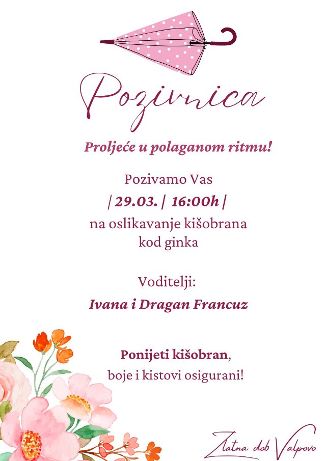 VALPOVO Poštovani umirovljenici, pozivamo vas u srijedu, 29.ožujka u 16:00 sati, kod ginka, na polagano proljetno buđenje uz antistresnu vježbu.