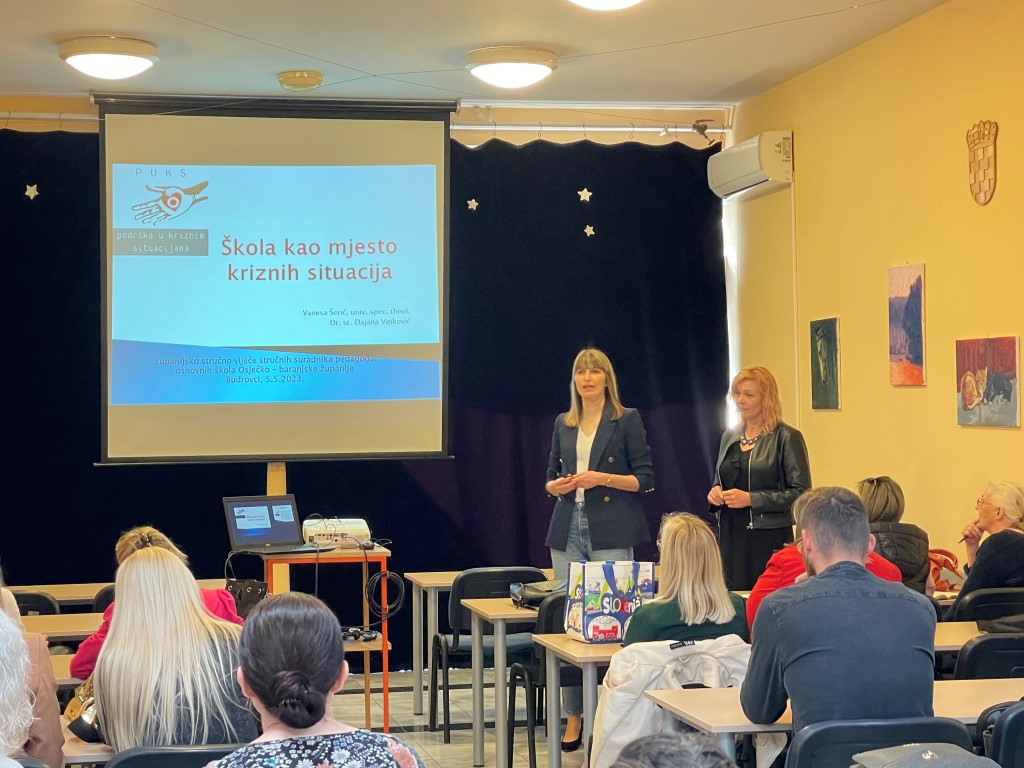 Započeli smo s aktivnostima novog projekta koji sufinanciraju grad Belišće i Osječko-baranjska županija koji nosi naziv "Budi tu". Projekt je usmjeren osobnom rastu i razvoju te povećanju mentalnog zdravlja i kvalitete života pojedinaca s naglaskom na važnost empatije i zajedništva. Tako su Vanesa Šerić i Dajana Vinković 5. 5. održale predavanje pedagozima Osječko-baranjske županije pod nazivom "Škola kao mjesto kriznih situacija" na županijskom stručnom skupu u Budrovcima kraj Đakova. Do kraja školske godine održat ćemo niz radionica o prepoznavanju vlastitih emocija, prijateljstvu i pružanju podrške s učenicima 7. i 8. razreda OŠ Ivana Kukuljevića Belišće i PŠ Veliškovci, te svih učenika u OŠ Bijelo Brdo.