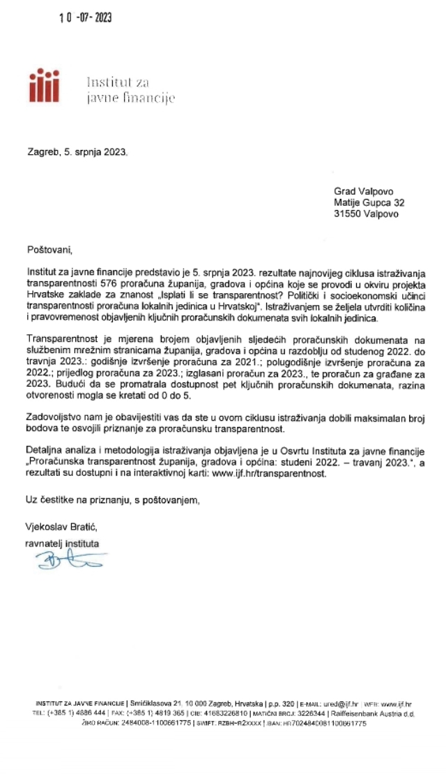 Istraživanjem je obuhvaćeno svih 576 proračuna županija, gradova i općina u Republici Hrvatskoj, a Grad Valpovo osvojio je maksimalan broj bodova – čistu 5-icu.
