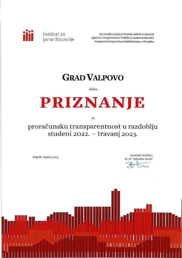 VALPOVO Institut za javne financije dodijelio je Gradu Valpovu nagradu za transparentnost gradskog proračuna.