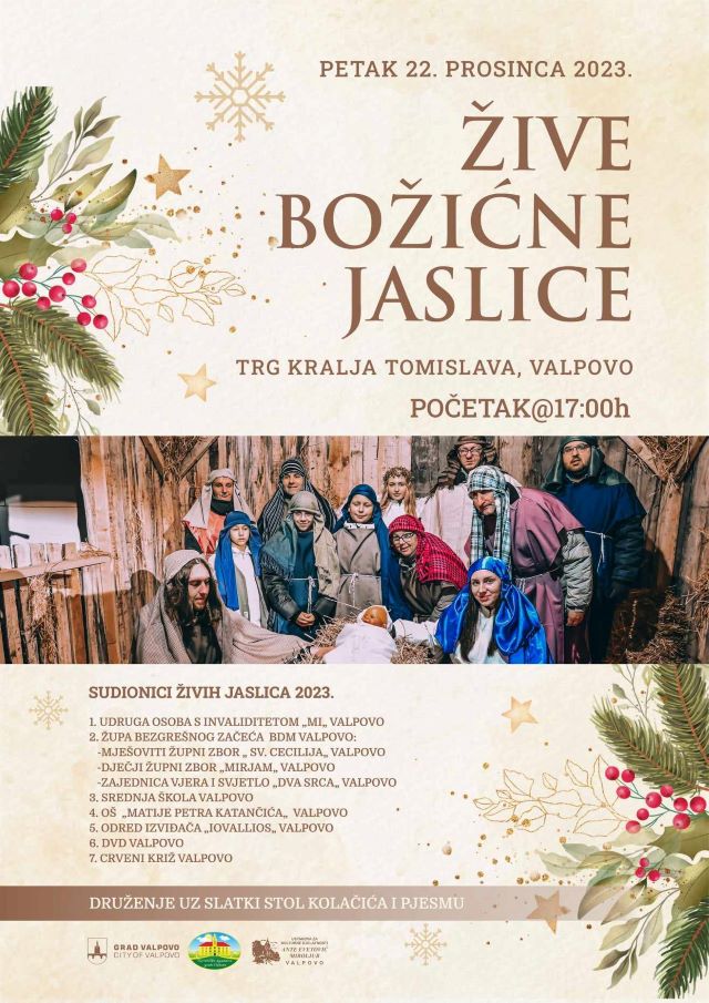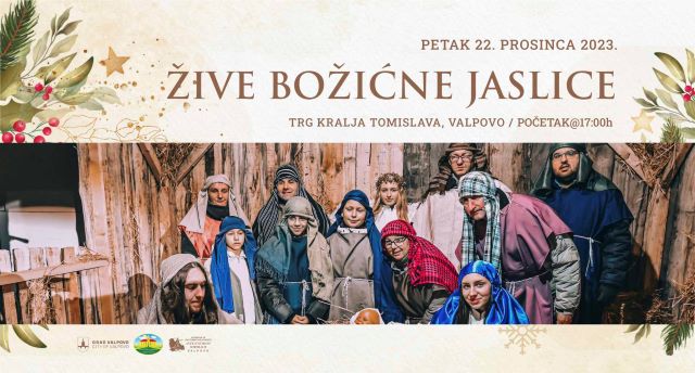 Grad Valpovo, Turistička zajednica Grada Valpova te članovi Udruge osoba s invaliditetom „MI“ Valpovo pozivaju sve ljude dobre volje na uprizorenje Živih božićnih jaslica koje će se ove godine upriličiti u petak, 22. prosinca 2023. godine s početkom u 17:00 sati ispred Župne crkve Bezgrešnog začeća Blažene Djevice Marije u Valpovu.