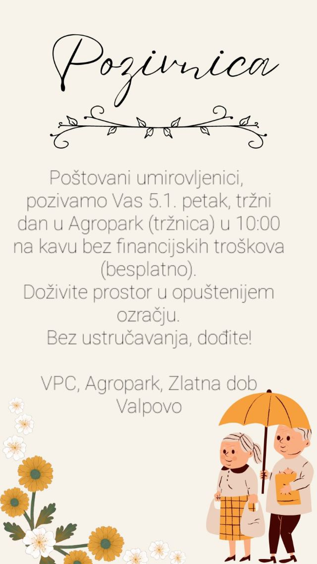 Vanja Miličević direktor Valpovačkog poduzetničkog centra, nositelja projekta Agroparka, valpovačke zelene tržnice, pozvao je valpovačke umirovljenike na kavicu u Agropark. U nastojanju da svoje starije sugrađane upoznaju s prostorom novootvorene zelene tržnice, u suradnji s voditeljicom projekta Zlatna dob, Stelom Horvat, u petak. 5. siječnja, u 10 sati, pozivaju valpovačke umirovljenike na besplatnu kavicu i druženje u komfornim prostorima Agroparka.