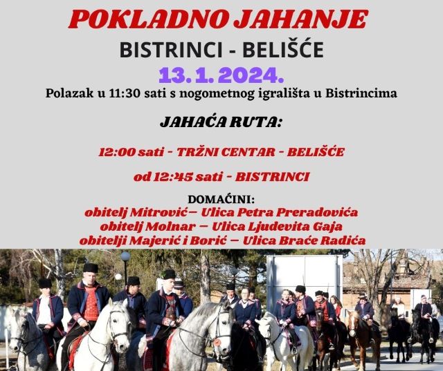 U subotu, 13. siječnja 2024. godine, pokladna povorka konjanika okupit će se ispred nogometnog igrališta u Bistrincima u 11:30 sati te će krenuti kroz Bistrince i u 12 sati stići na Tržni centar u Belišće.