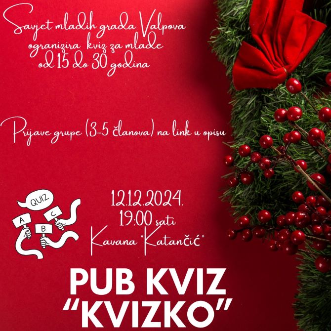 "Kvizko" će se održati u četvrtak, 12.12.2024. godine u 19:00 sati u Gradskoj kavani "Katančić" Valpovo.
