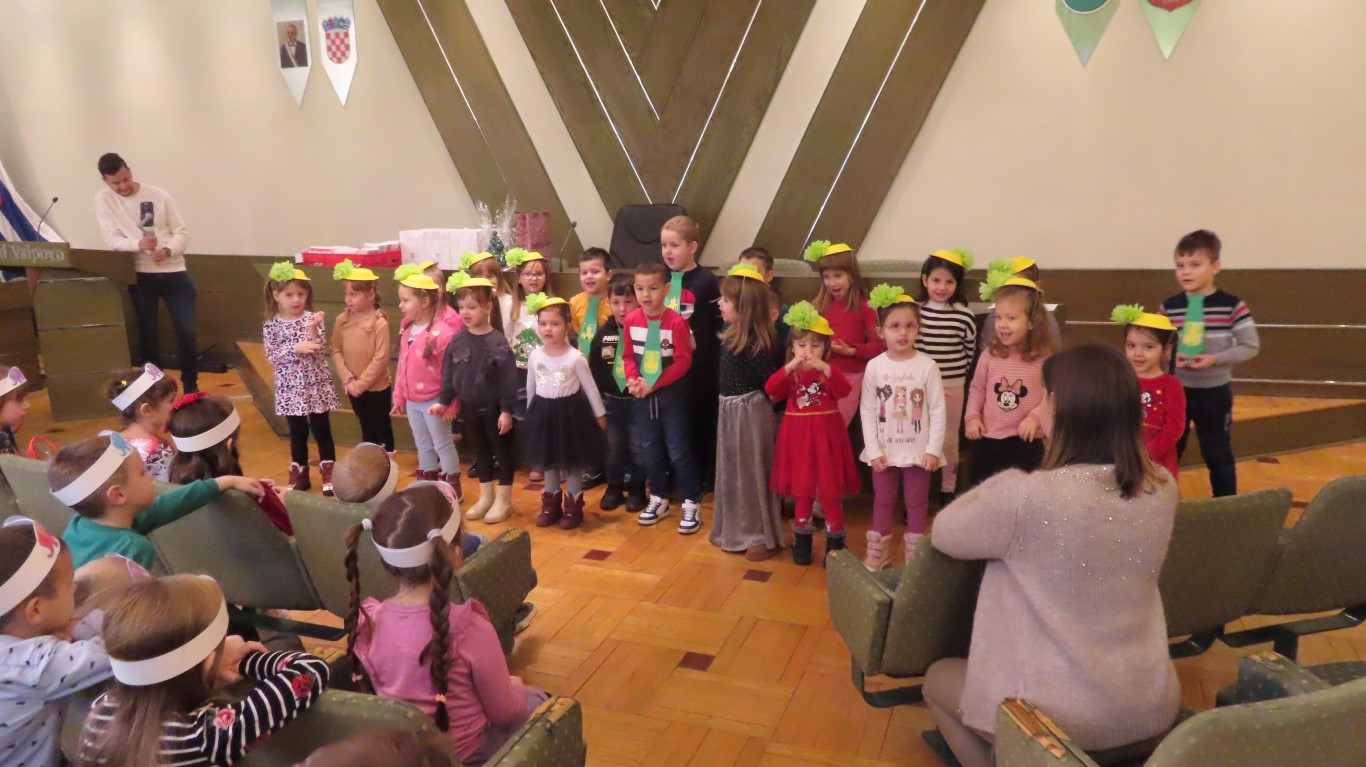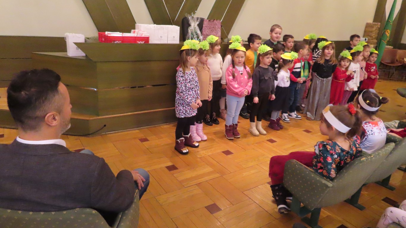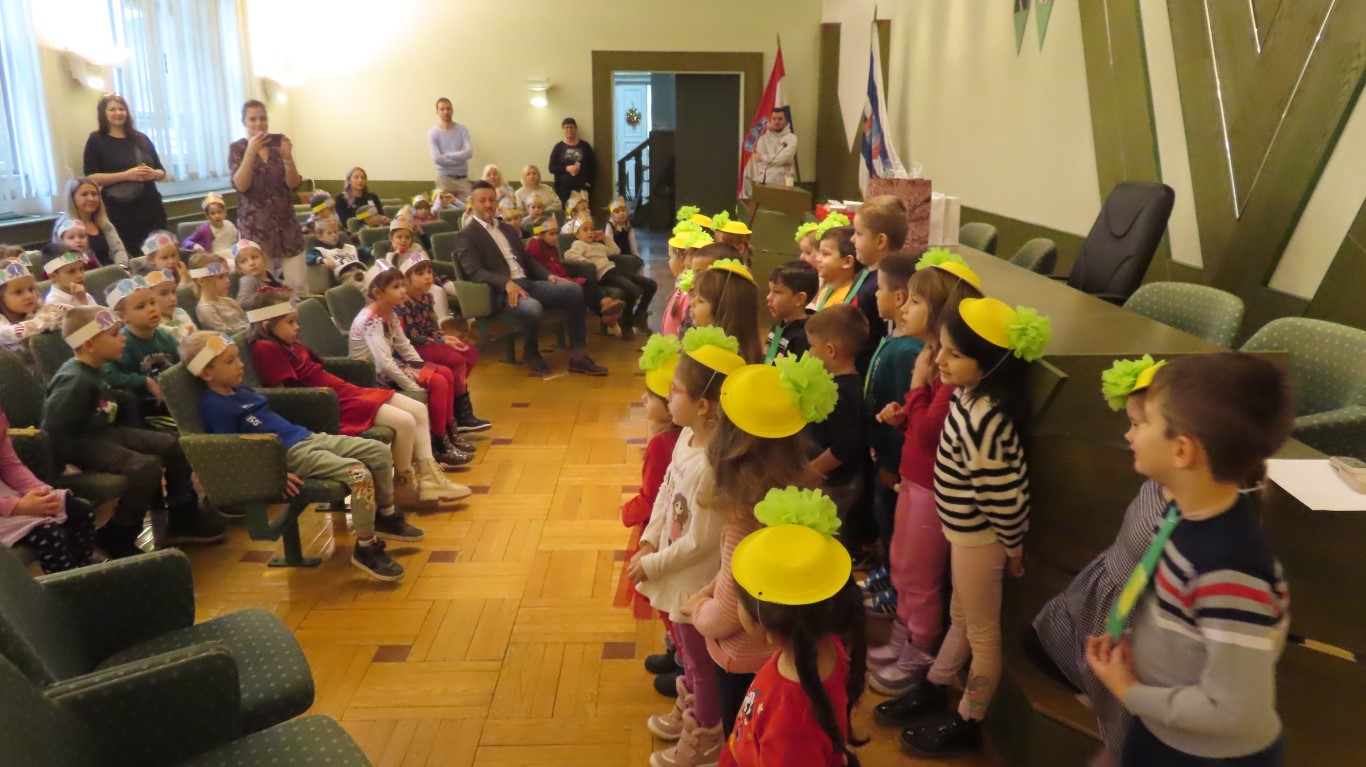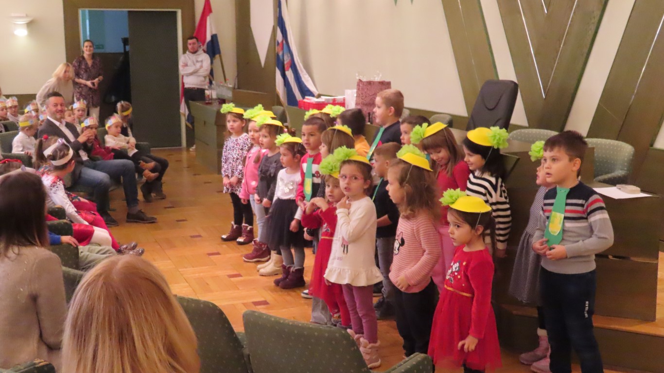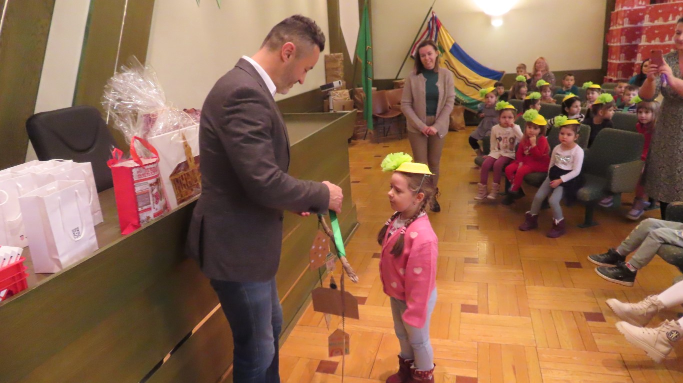 Najmlađi sugrađani, polaznici dječjih vrtića Maza i Moj Bambi u pratnji ravnatelja vrtića i svojih odgajateljica ispunili su veliku vijećnicu razdraganim pjesmicama, recitacijama, smijehom i veseljem.