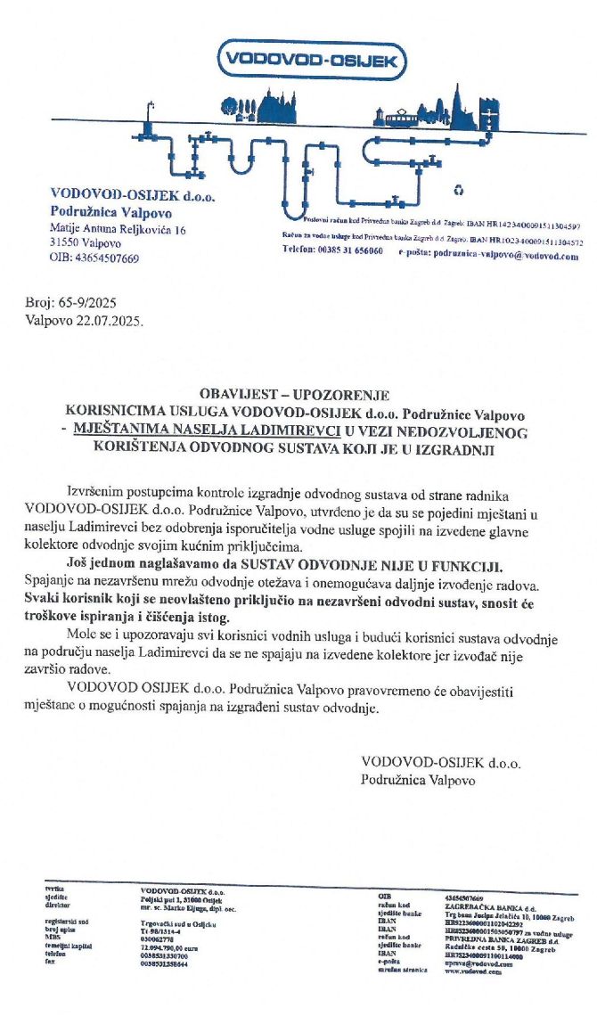 VALPOVO VODOVOD-OSIJEK d.o.o. Podružnica Valpovo obratila se upozorenjem mještanima Ladimirevaca zbog nedozvoljenog korištenja odvodnog sustava u izgradnji.