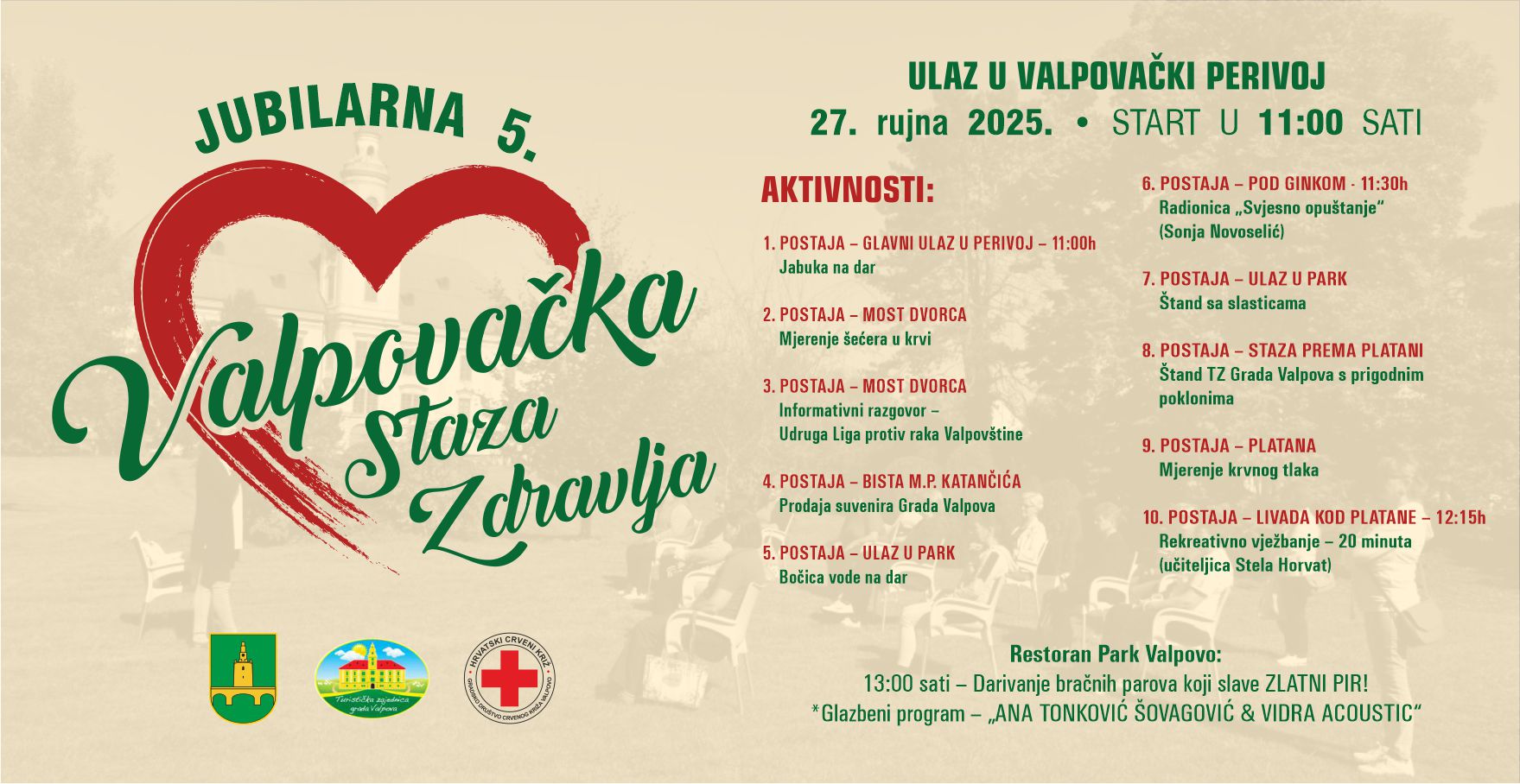 Turistička zajednica Grada Valpova i Grad Valpovo, u suradnji s Gradskim društvom Crvenog križa Valpovo i HKUD-om „Valpovo 1905“, pozivaju sve građane i goste – osobito starije sugrađane – na jubilarnu petu „Valpovačku stazu zdravlja“, koja će se održati u subotu, 27. rujna 2025. godine, s početkom u 11:00 sati ispred glavnog ulaza u valpovački perivoj.