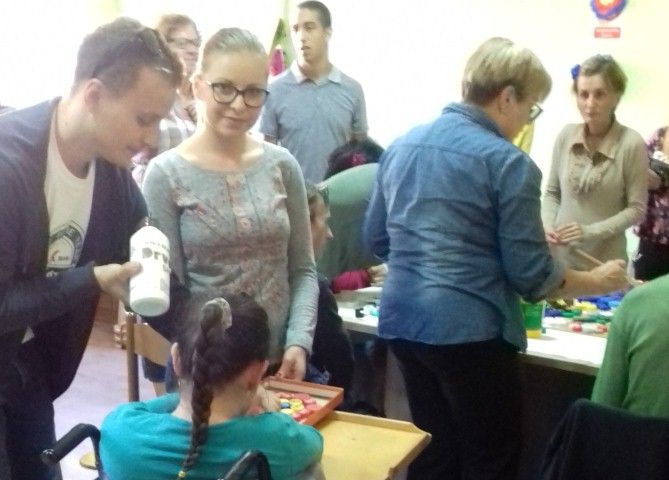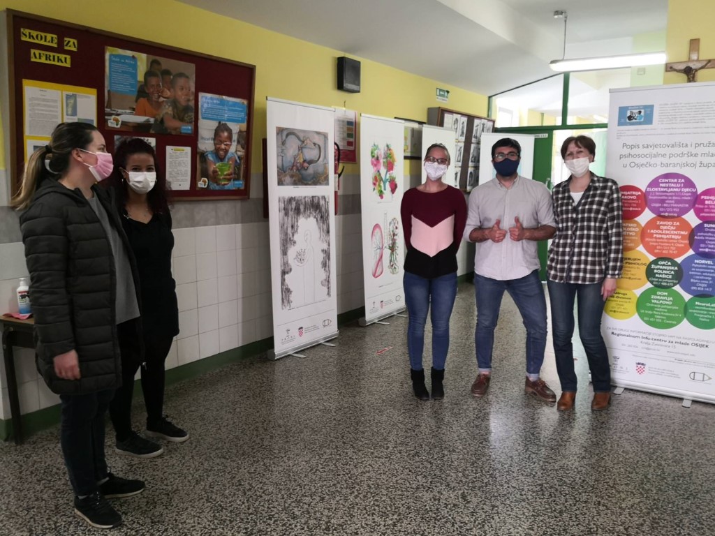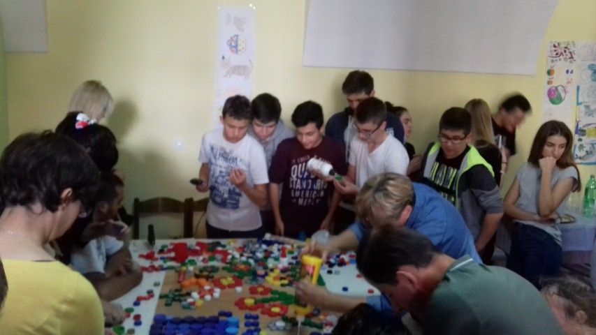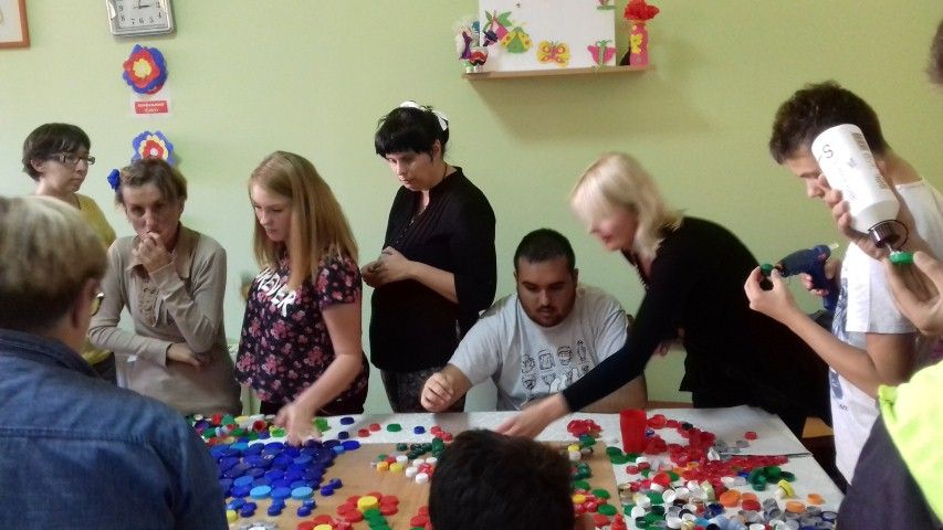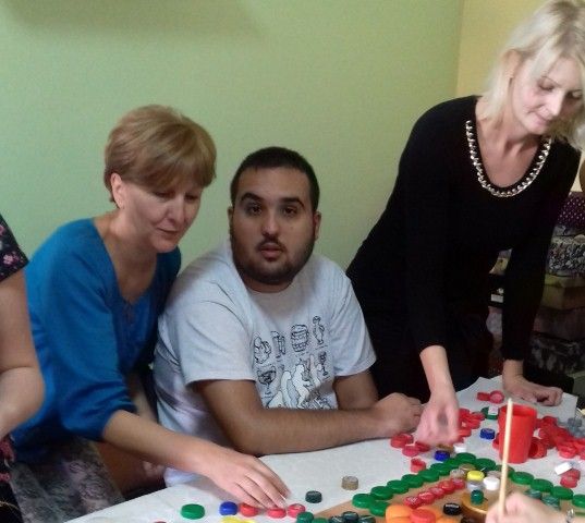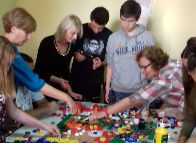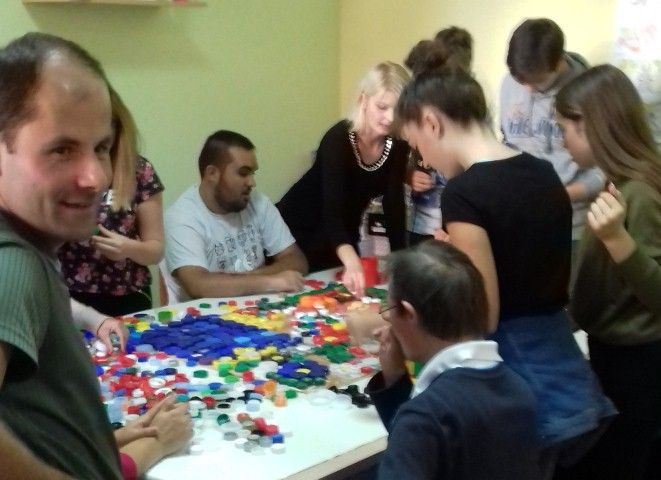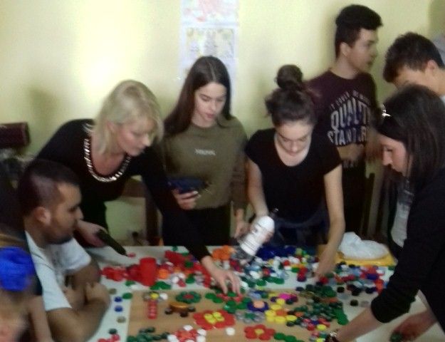 VALPOVO Učenici 1. a razreda Srednje škole Valpovo sa svojom razrednicom Marijom Jelkić posjetili su članove udruge „MI“ iz Valpova te se u njihovom novoobnovljenom prostoru zajedno družili stvarajući mozaik od plastičnih čepova.