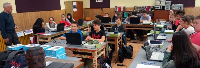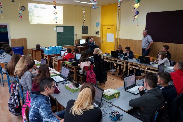 Nastavnik tehničke kulture Davor Milošević dočekao je u razredu prof. Marijana Antolovića koji je sa 40 učenika (dva puta po dva sata) radio nastavnu cjelinu robotika.