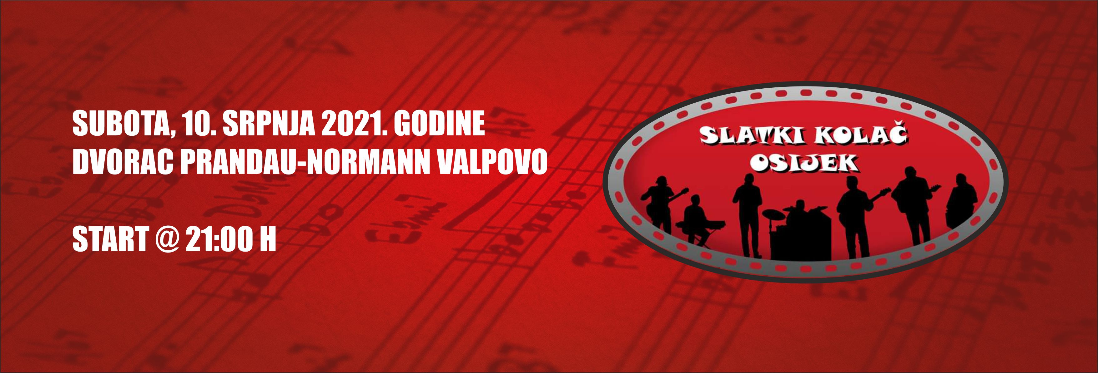VALPOVO Turistička zajednica Grada Valpova i Grad Valpovo Vam donose koncert osječkog benda „Slatki kolač“ u subotu, 10. srpnja 2021. godine u dvorištu dvorca Prandau-Normann s početkom u 21:00 sat!