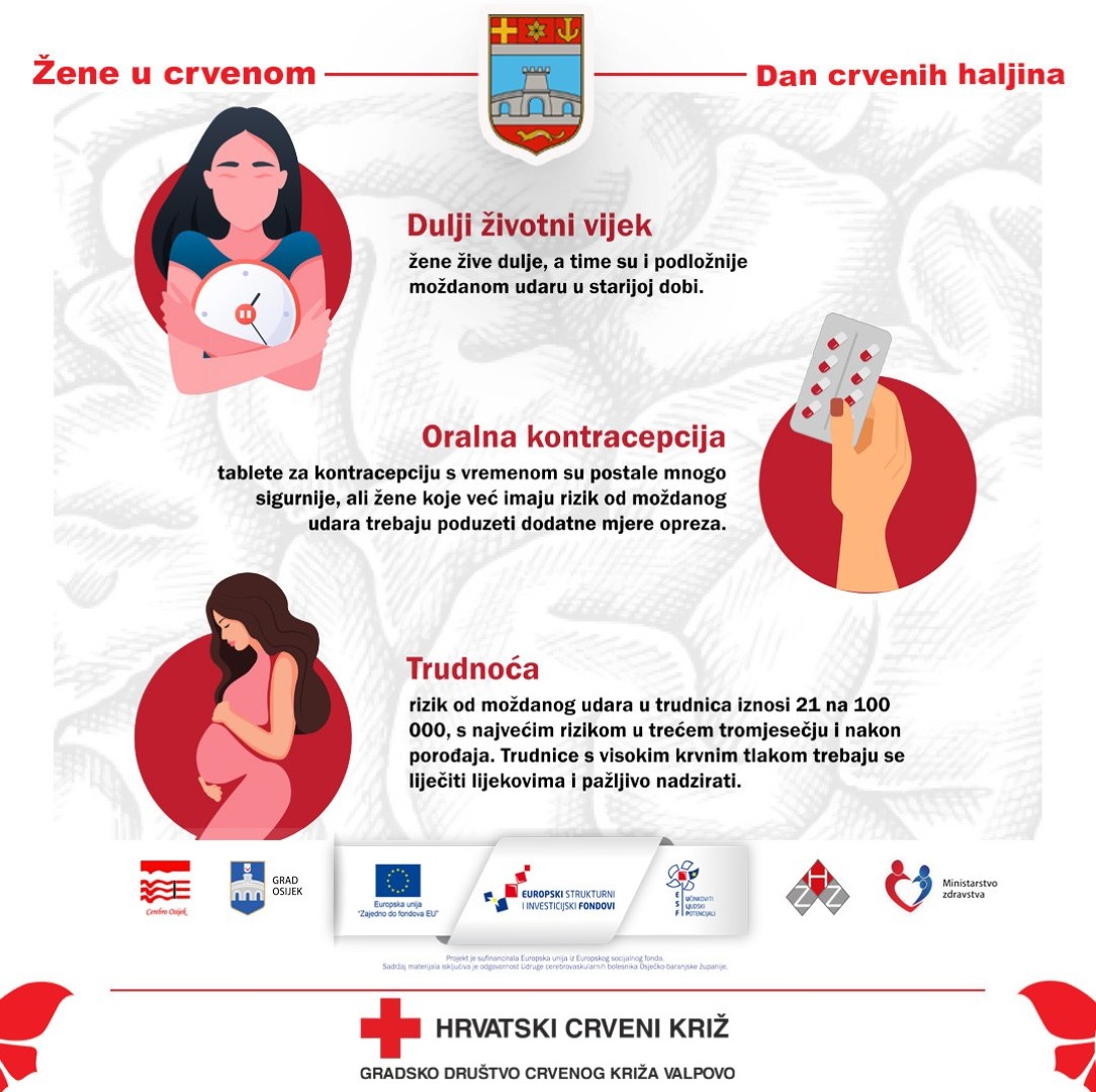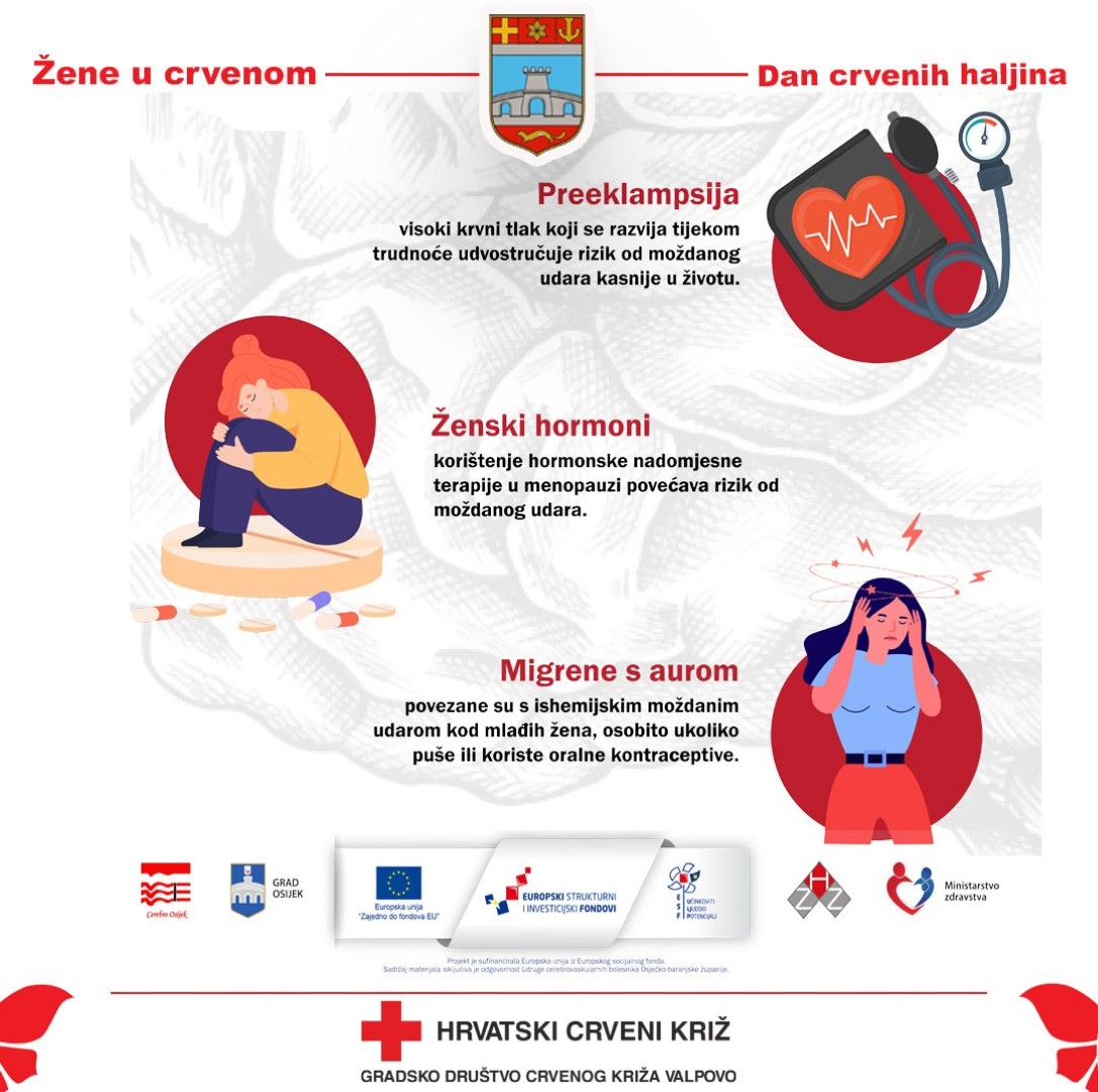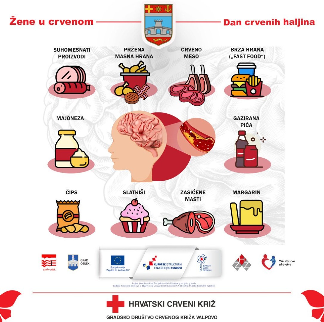 Dan crvenih haljina obilježava se prvoga petka u veljači, a Društvo Crvenog križa Osječko-baranjske županije u suradnji s Osječko-baranjskom županijom, Domom zdravlja Osijek, Medicinskom školom Osijek, Veslačkim klubom Iktus, Ugostiteljsko-turističkom školom Osijek, Hrvatskim narodnim kazalištem Osijek, Školom primijenjene umjetnosti i dizajna Osijek i brojnim drugim partnerima, donosi savjete o prehrani, zdravlju i prevenciji moždanog udara.