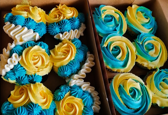 -Slatka srca su originalni medenjaci, prekriveni žutom i šećernom masom koje sam izrezala i dekorirala po svojoj kreativnoj verziji. Isto su tako nastale i male tortice ili "cupcakesi" u kremastim žuto - plavim cvjetovima kao simbol svjetla i slobode za Ukrajinski narod.