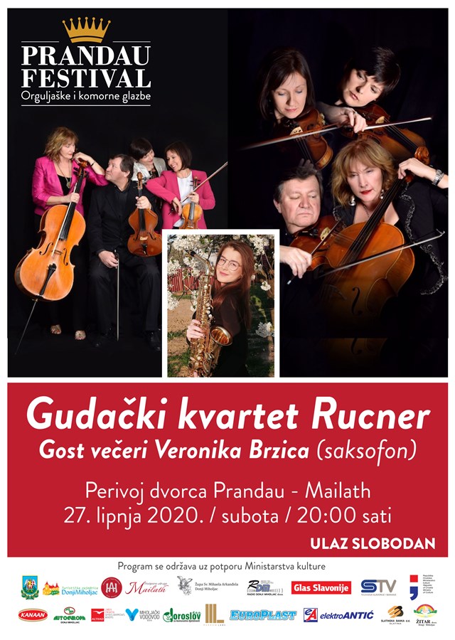 Sad u subotu 27. lipnja s početkom u 20h očekuje nas koncert jednog od najboljih gudačkih kvarteta u Hrvatskoj Kvarteta Rucner. Oni nas uvijek iznenade originalnim i izvrsnim izborom programa. Na ovom koncertu su to djela: Beethovena, Kogana, Piazzolle, ali i hrvatskih skladatelja: Uhlika, Cossetta, Makara i Stratika. Njihova gošća na koncertu je mlada saksofonistica Veronika Brzica. Zato najavite, posjetite i popratite nam ovaj koncert našeg ovogodišnjeg izdanja PRANDAU festivala. Ulaz slobodan! Koncert je u dvorcu Mailath-Prandau.