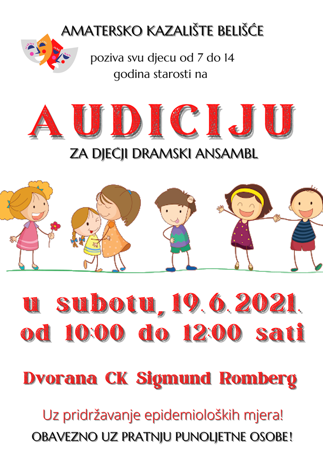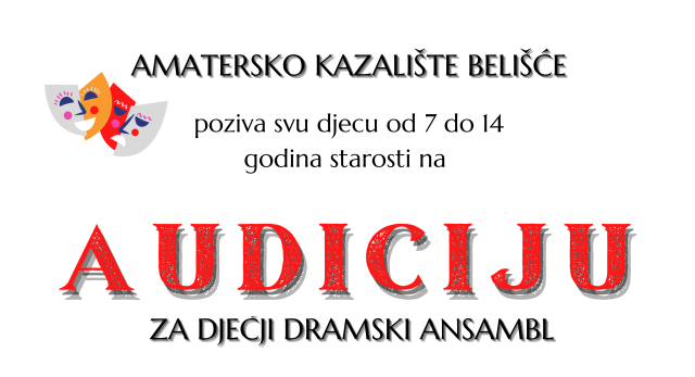 BELIŠĆE Amatersko kazalište Belišće i Centar za kulturu Sigmund Romberg pozivaju svu zainteresiranu djecu u dobi od 7 do 14 godina na audiciju za nove članove Dječjeg dramskog ansambla AK Belišće.
